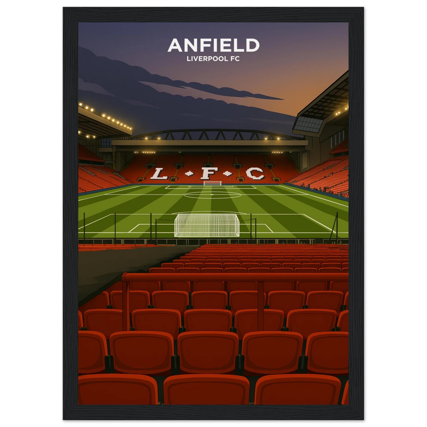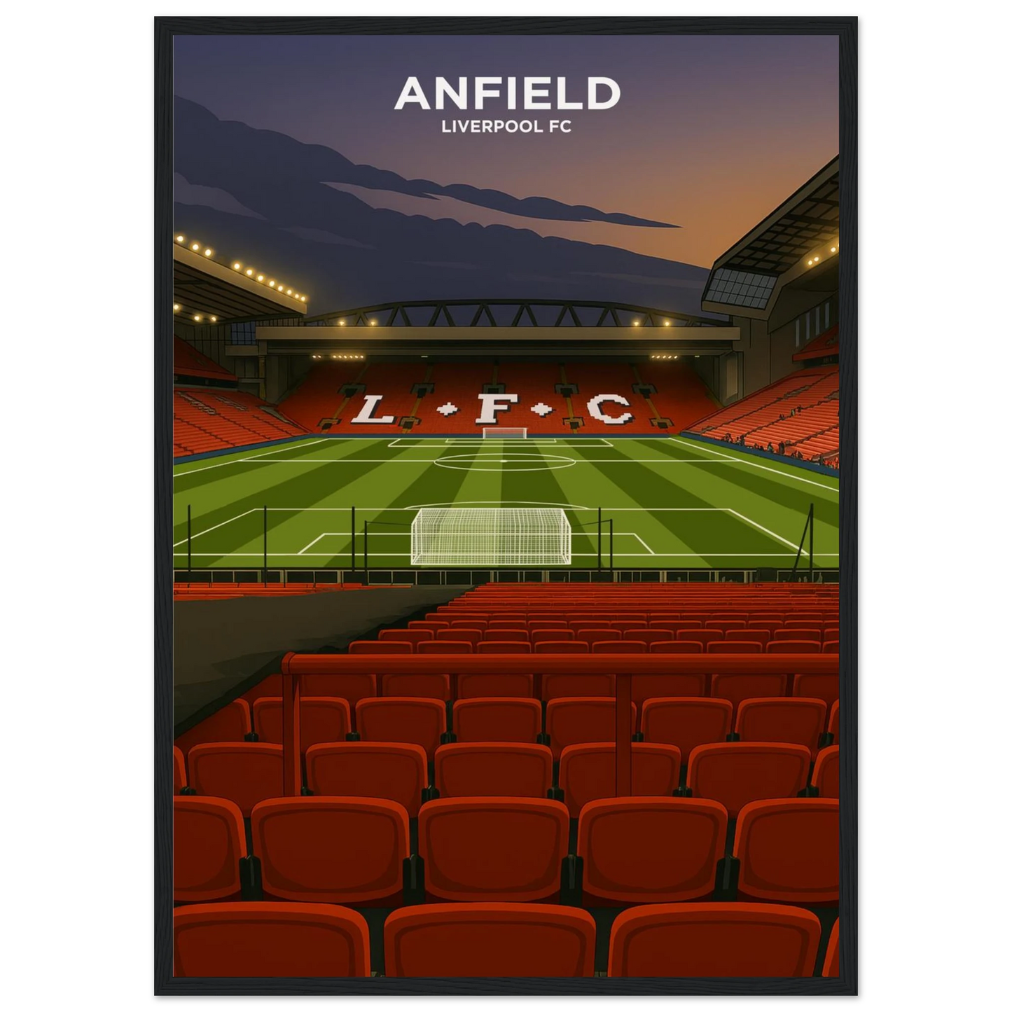 This twilight illustration of Anfield captures the calm before kickoff, with a glowing sky and empty red seats framing the pitch. The iconic “L F C” lettering stands out across the far stand, anchoring the scene in football tradition. A perfect piece for Liverpool fans who appreciate atmosphere, architecture, and legacy.