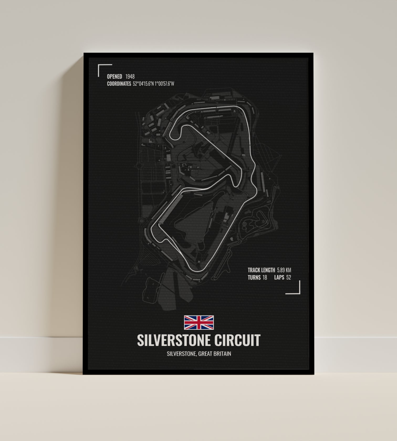 Bring the thrill of British motorsport to your space with this bold, stylized map of the iconic Silverstone Circuit. Featuring precise track details and a striking Union Jack centerpiece, it’s a sleek tribute to one of Formula 1’s most legendary venues. Perfect for racing fans, sports illustrators, or anyone who lives life in the fast lane.