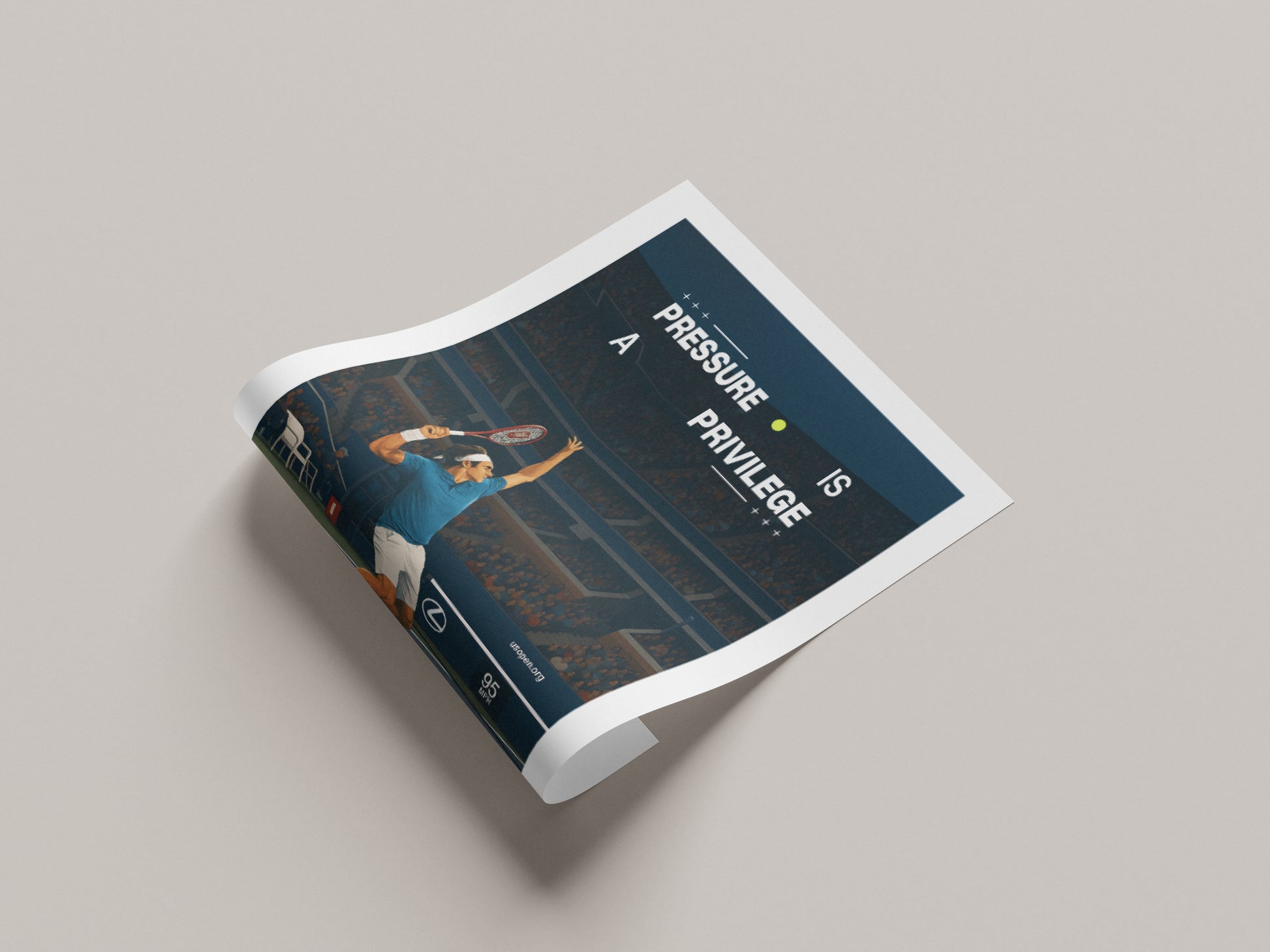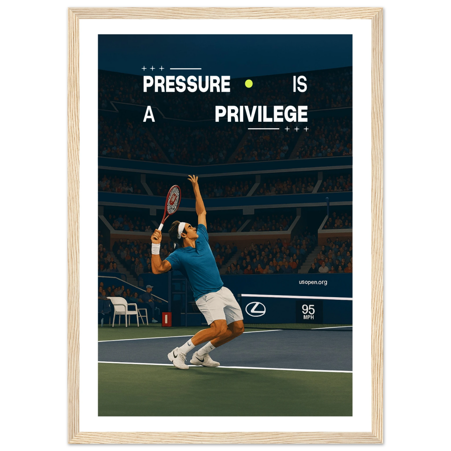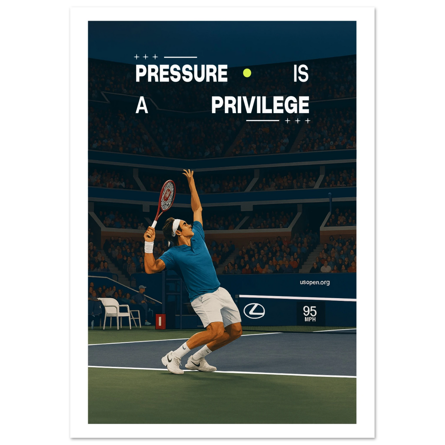 This striking artwork features Roger Federer mid-serve at the US Open, set against a vibrant stadium backdrop. The bold typography of Billie Jean King’s iconic quote — “Pressure is a Privilege” — adds a powerful layer of inspiration, making it a perfect piece for tennis fans and motivational spaces alike.
