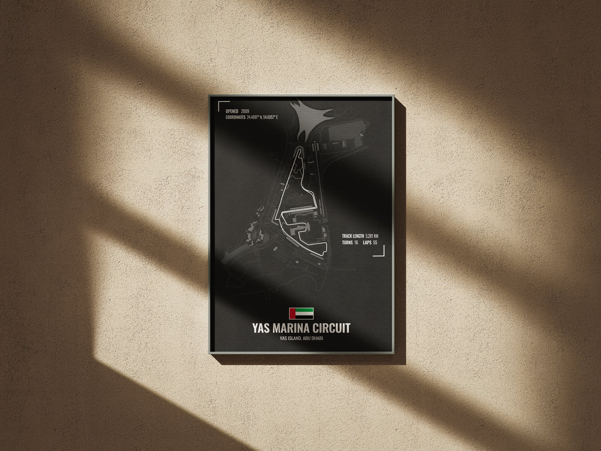 Clean, data-driven, and visually striking—this Yas Marina Circuit artwork captures the precision and drama of Abu Dhabi’s premier F1 track. A sleek addition for fans who appreciate design as much as racing.
